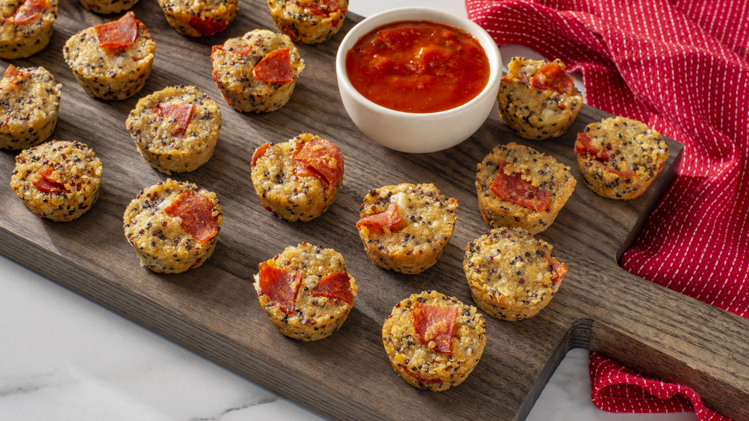 Making pizza from scratch can be a daunting task — even without a newborn strapped to your chest! Instead, reach for these zippy, bite-sized pizza copycats and satisfy the craving, without lifting a finger. Tender and savory, loaded with marinara, pepperoni, cheese and quinoa, they’ll disappear as quick as your family’s favorite 12-inch pie.